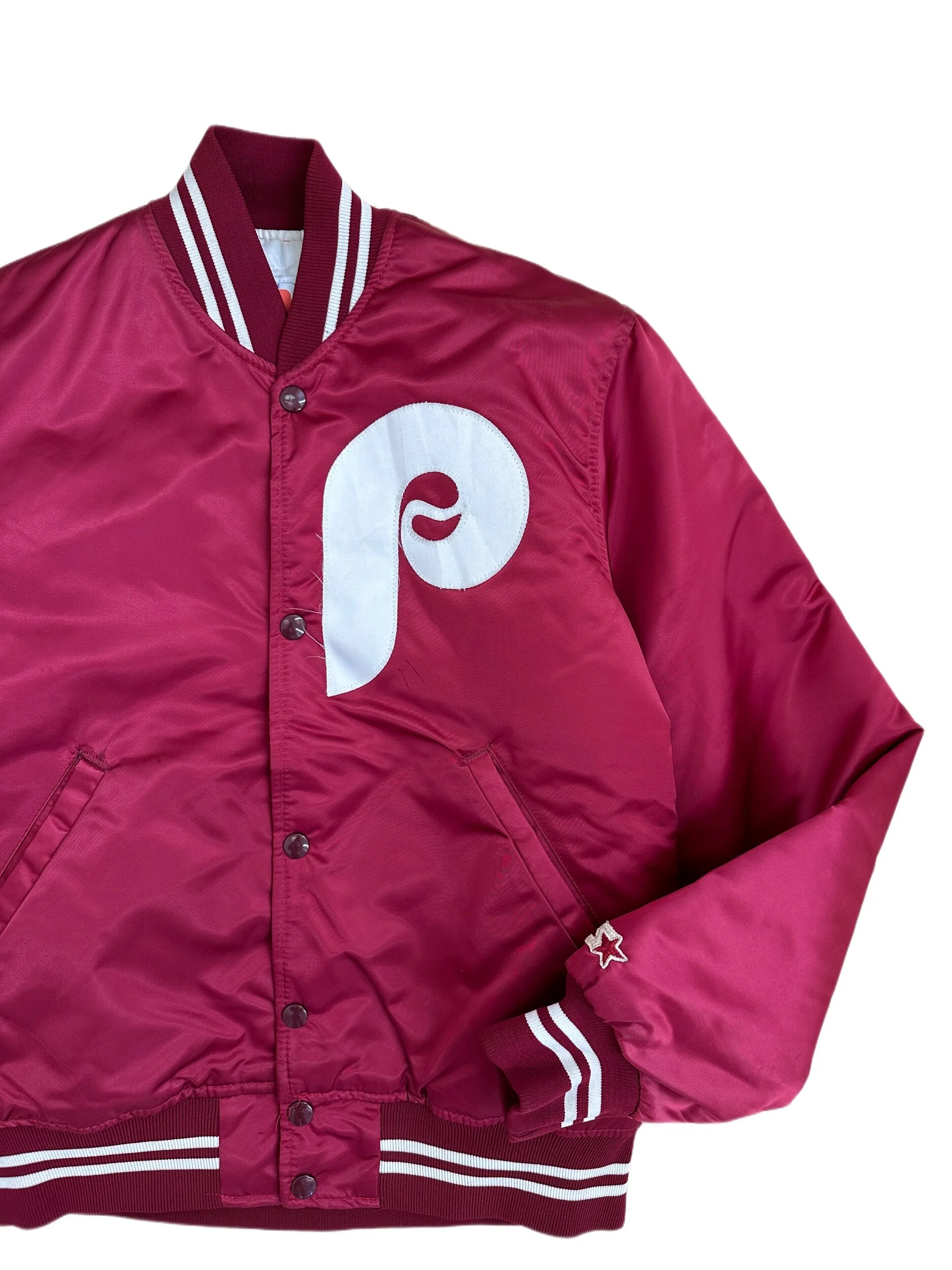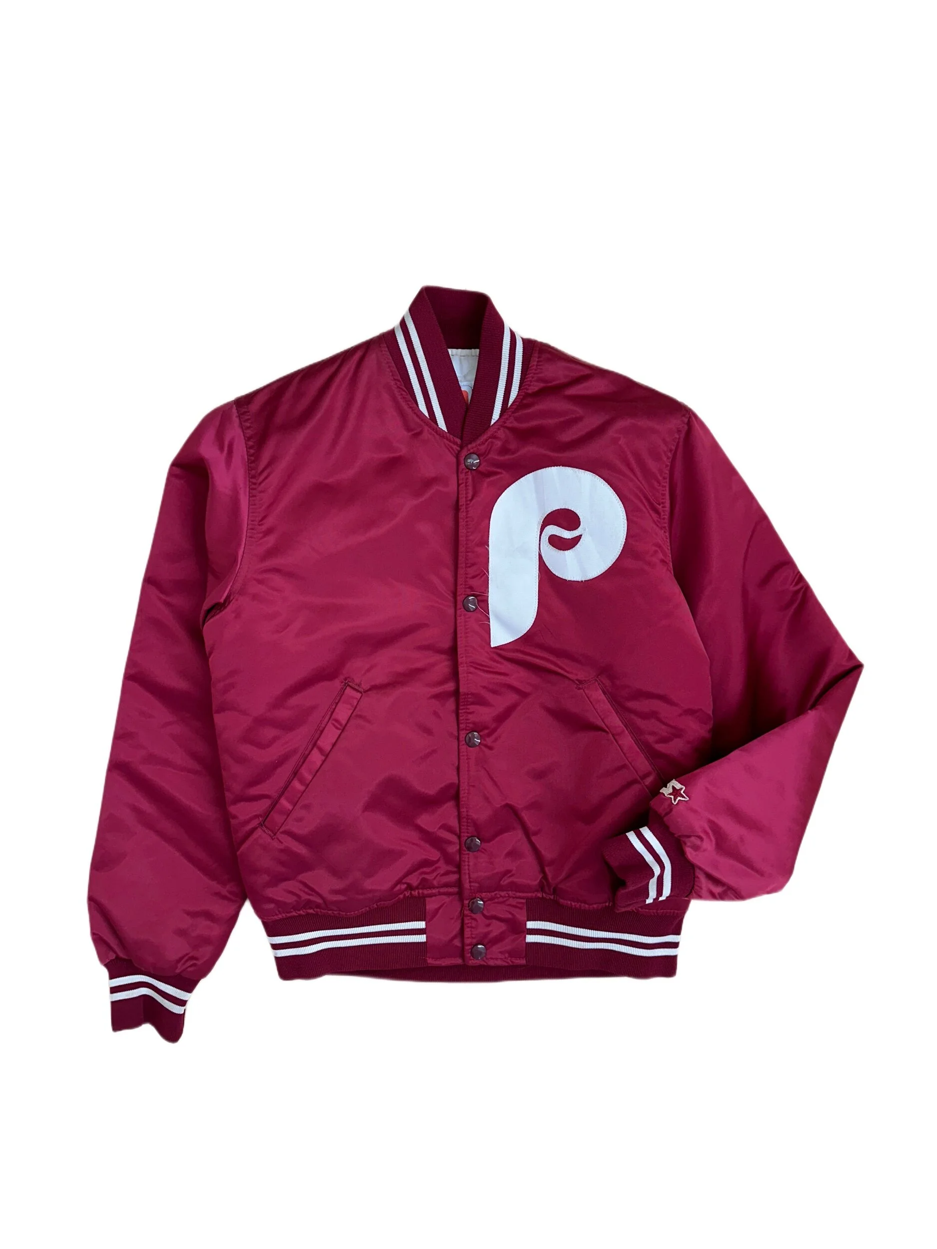 Archive › 80's Phillies Satin Starter Jacket (S) Image 1 of 3 Image 2 of 3 Image 3 of 3 80's Phillies Satin Starter Jacket (S) $170.00 sold out Size: SmallMeasurements: 20 x 24.5Flaws: has some minor wear Sold Out Added! Size: SmallMeasurements: 20 x 24.5Flaws: has some minor wear