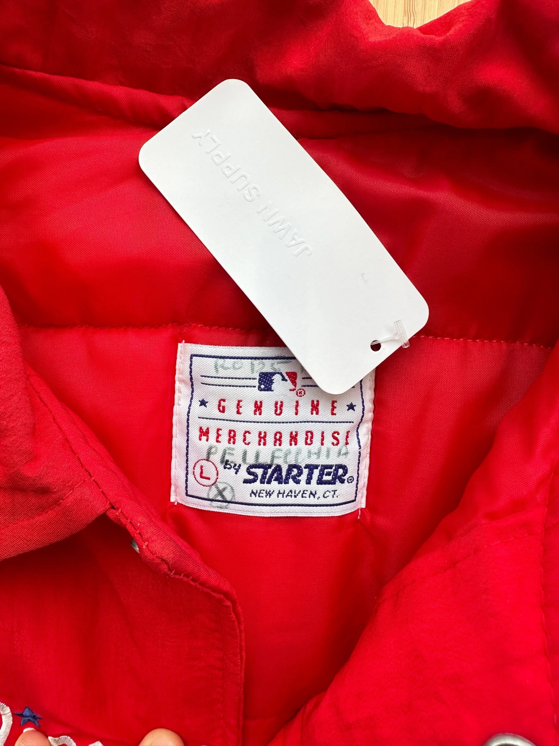 Shop › 90's Phillies Jacket (XL) Image 1 of 3 Image 2 of 3 Image 3 of 3 90's Phillies Jacket (XL) $135.00 sold out Size: XLMeasurements: 25.5 x 26.5Flaws: None Sold Out Added! Size: XLMeasurements: 25.5 x 26.5Flaws: None
