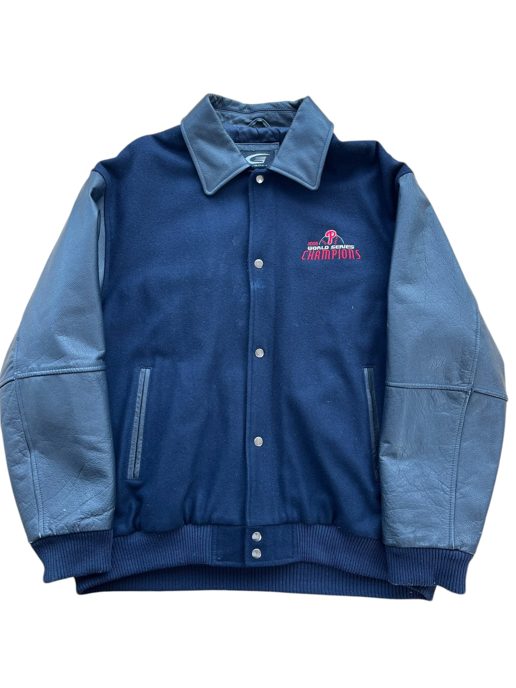 Shop › 2008 Phillies Jacket (L) Image 1 of 4 Image 2 of 4 Image 3 of 4 Image 4 of 4 2008 Phillies Jacket (L) Sale Price: $98.00 Original Price: $148.00 sold out Size: LargeMeasurements: 27.5 × 30 Flaws: Stains on the front of the jacket (as pictured) Sold Out Added! Size: LargeMeasurements: 27.5 × 30 Flaws: Stains on the front of the jacket (as pictured)