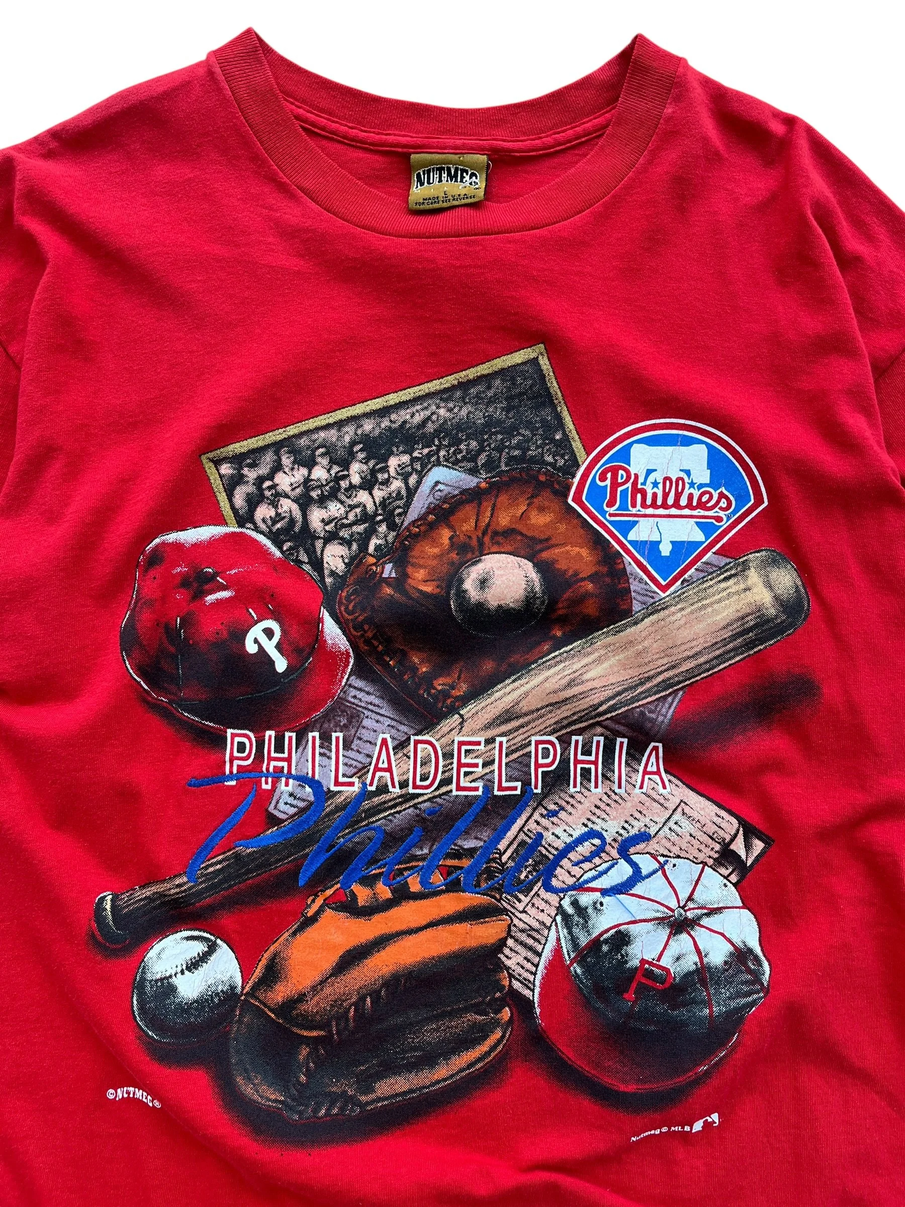 Shop › 90s Phillies Nutmeg Tee (L) Image 1 of 3 Image 2 of 3 Image 3 of 3 90s Phillies Nutmeg Tee (L) $80.00 Size: LargeMeasurements: 23 × 29 Flaws: No Major Flaws Purchase Added! Size: LargeMeasurements: 23 × 29 Flaws: No Major Flaws