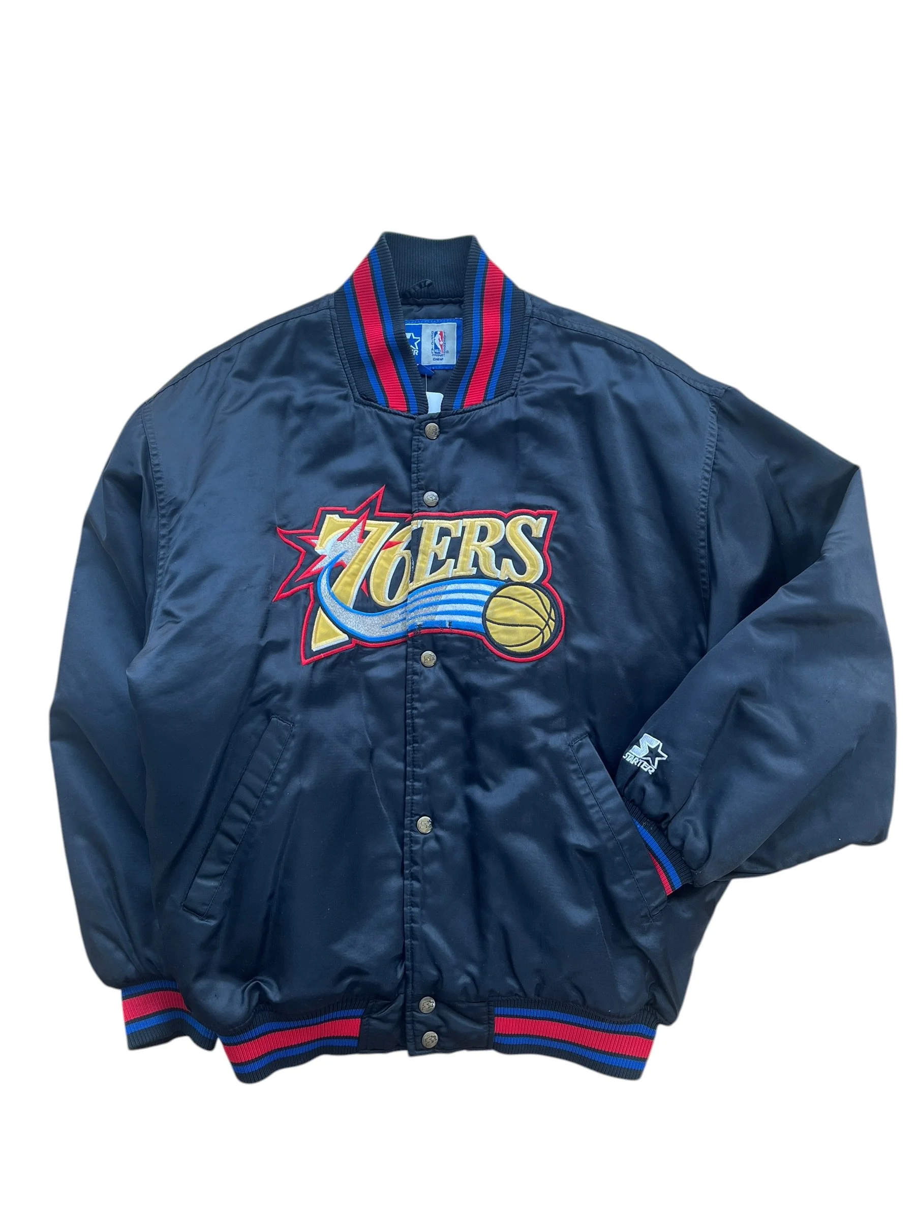 Shop › 90s 76ers Starter Satin Jacket (L) Image 1 of 4 Image 2 of 4 Image 3 of 4 Image 4 of 4 90s 76ers Starter Satin Jacket (L) Sale Price: $198.00 Original Price: $298.00 Size: L Measurements: 26.5 × 28Flaws: Distressing on the logo embroidery Purchase Added! Size: L Measurements: 26.5 × 28Flaws: Distressing on the logo embroidery