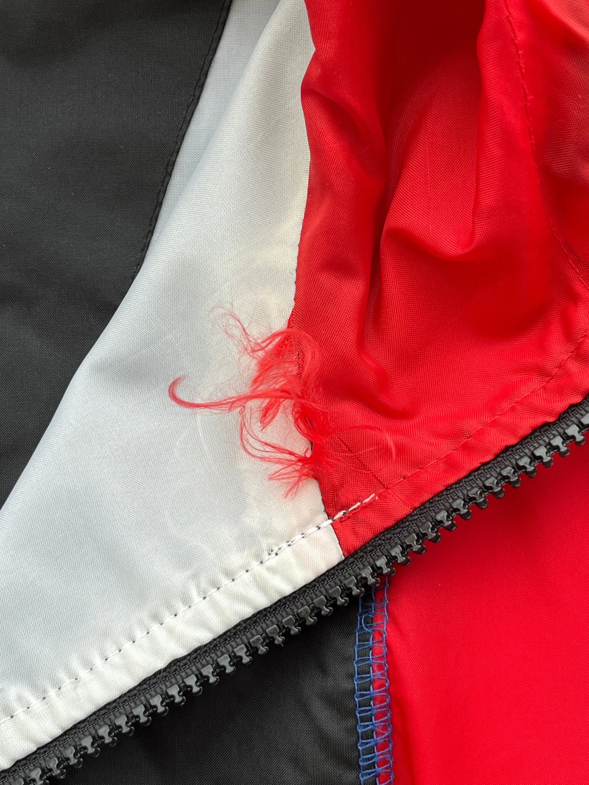 Flaws: Fraying on hood ( as pictured) and small black marks on sleeve and side of the windbreaker